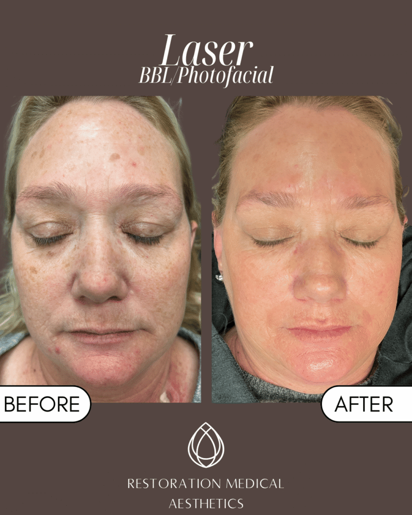 BBL or photofacial treatments target dark spots and uneven pigmentation by delivering controlled pulses of light energy into the skin, gently breaking up excess pigment for a clearer, more even tone.